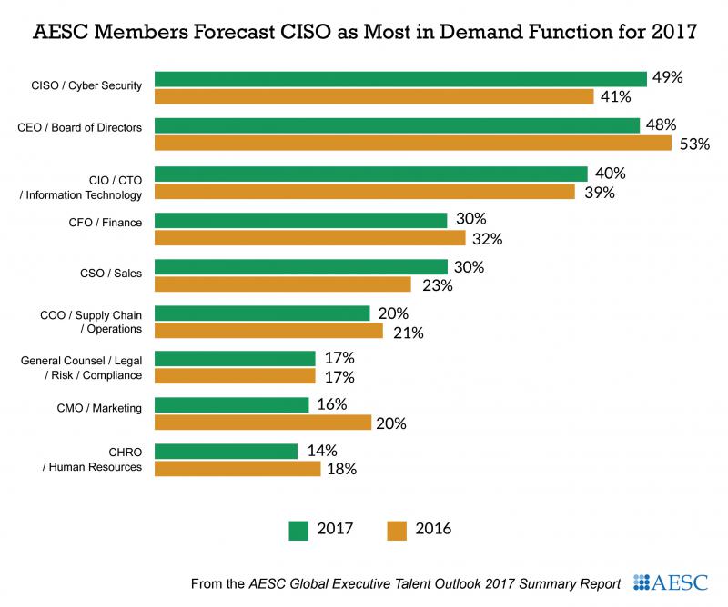 The forecast for the Technology sector also informs the functions that AESC members expect to be most in-demand during 2017. For the first time, Chief Information Security Officers (CISOs) now rank among AESC members as the top function with the most growing demand. As technology and digitalization continue to disrupt all sectors, organizational leaders turn to trusted advisors to find and develop the right talent and strategies to turn disruption into opportunity.