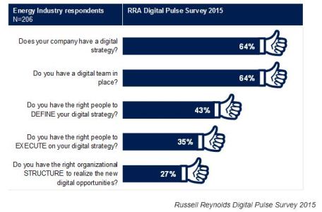 The following is an excerpt from the report: “According to energy industry executives who took part in the Digital Pulse survey, the top three barriers for an effective digital strategy are: 1) lack of digital expertise and skills; 2) insufficient management bandwidth; and 3) leadership’s perception of digital strategy as secondary. Interestingly enough, even with a dearth of capabilities, time, and sense of urgency from the top down, according to Digital Pulse respondents from the energy sector, 37% of companies depend on their CEO to set digital vision and strategy, while 16% relies on the CIO and 15% the CMO.”