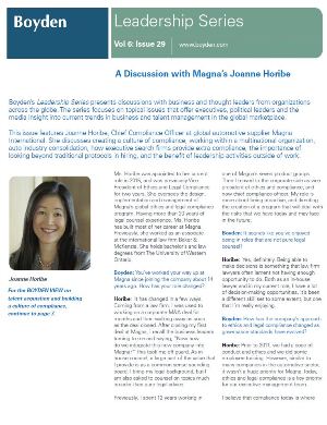 Boyden features Joanne Horibe, Chief Compliance Officer at global automotive supplier Magna International. She discusses creating a culture of compliance, working within a multinational organization, auto industry consolidation, how executive search firms provide extra compliance, the importance of looking beyond traditional protocols in hiring, and the benefit of leadership activities outside of work.